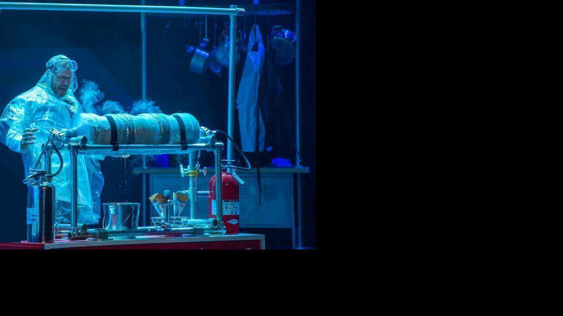 Billed as a culinary variety show, it features food, comedy, music, puppets and even has a “poncho zone,” where people in the first few rows are provided protective gear in case of what Brown has described as “airborne particulate matter.”