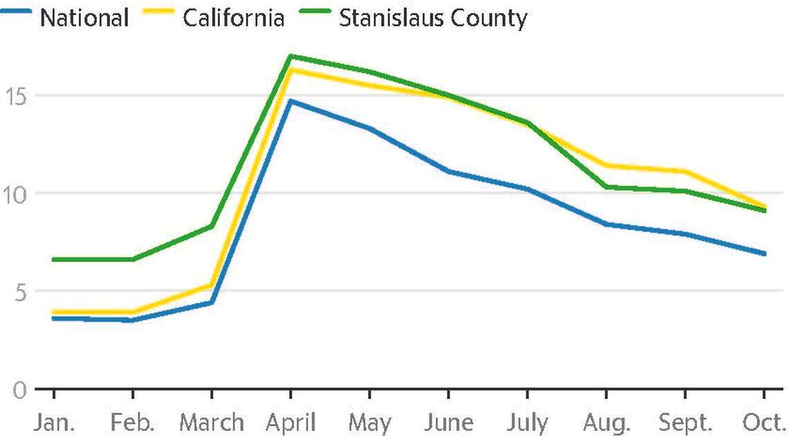 Unemployment in Stanislaus County continued to fall in October, but increased coronavirus restrictions could again cause a temporary rise in the jobless numbers as winter approaches.