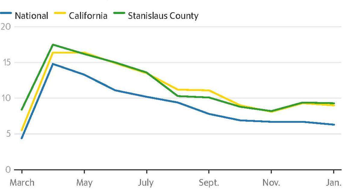 Stanislaus County saw only a modest decline in unemployment in January, but new federal stimulus dollars and increased vaccine availability point to stronger recovery in the coming months.