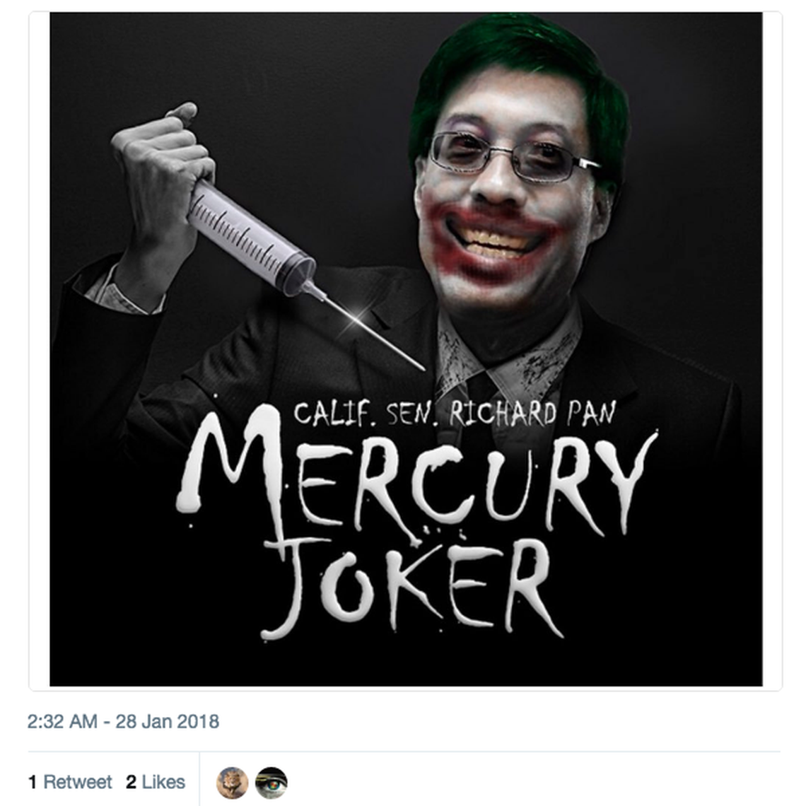 Rummel and Burkitt have a history of posting provocative tweets about Pan, including references to him as a “Mercury joker” and depictions of him as a Nazi. Shortly after Gov. Jerry Brown signed the bill, Burkitt tweeted that “vaccines just might cause leukemia” — a claim strongly refuted by the scientific community.