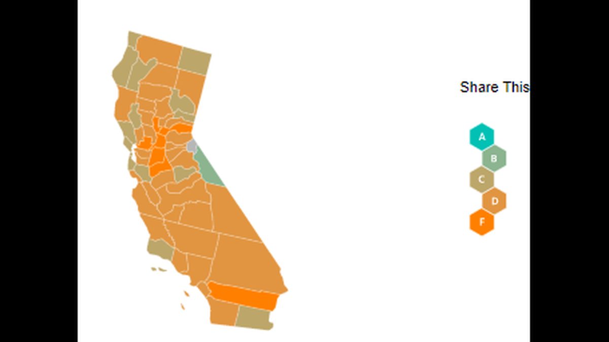 The five worst counties in California were Sacramento, Sutter, Solano, Riverside and Placer — all of which received an F. Alpine County was not given a grade by Unacast.