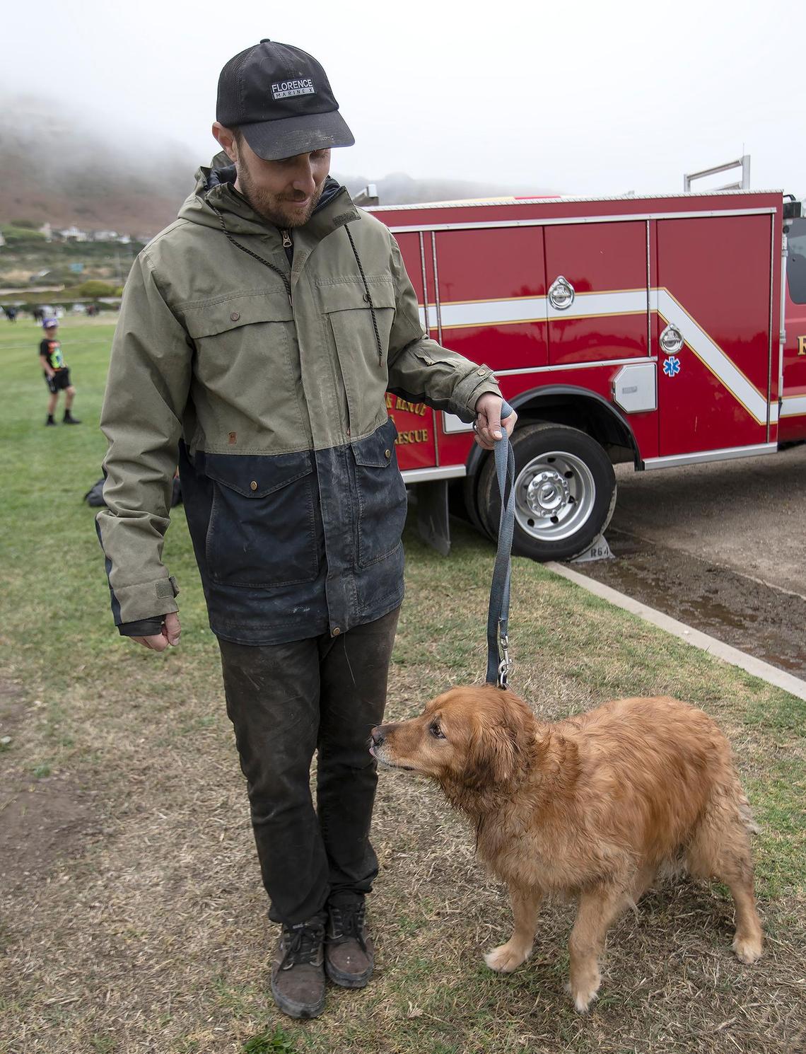 Cal Fire personnel rescued a man and his golden retriever Thursday after they became trapped on a beach at the bottom of the cliffs at Dinosaur Caves Park in Pismo Beach. Neither were injured.