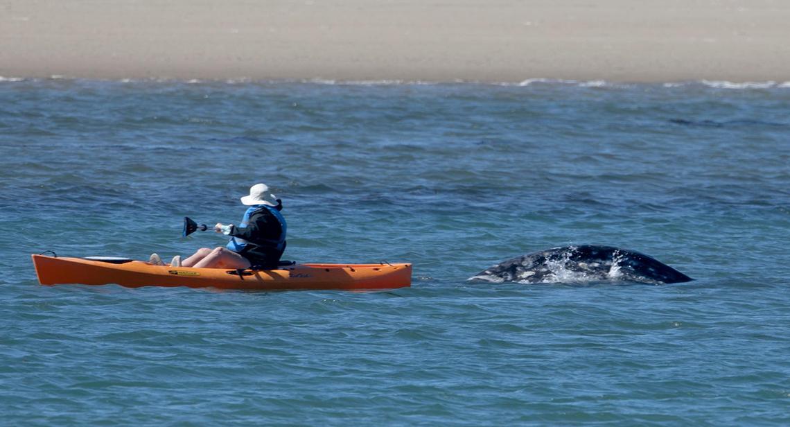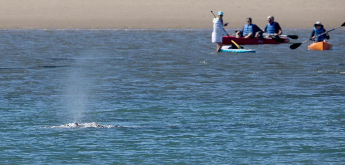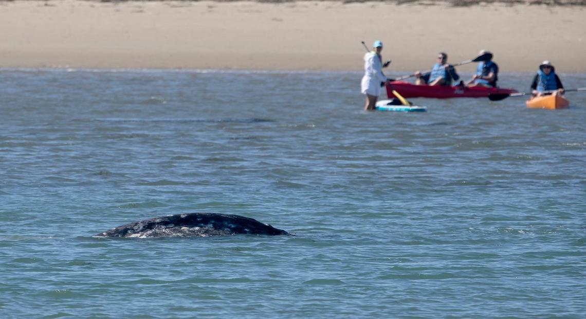 On Thursday, the whale was seen surfacing periodically in the area near Morro Rock, to the delight of paddle boarders and kayakers on the water and visitors on the shore.