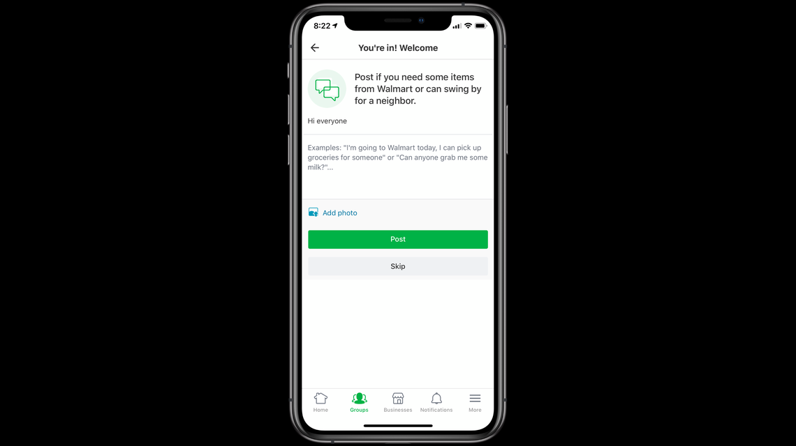 Next, you’ll be able to share a note in the group feed if you need help getting items from Walmart or want to help others get what they need. After community members connect in the group feed, they can work out shopping trip specifics on the message board or in a direct message.