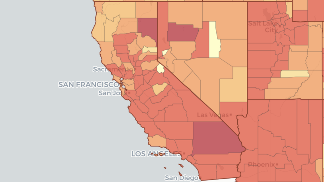 A 20-person gathering in Fresno County carries a 76% risk level while Sacramento County has a 46% risk level for an event of the same size.