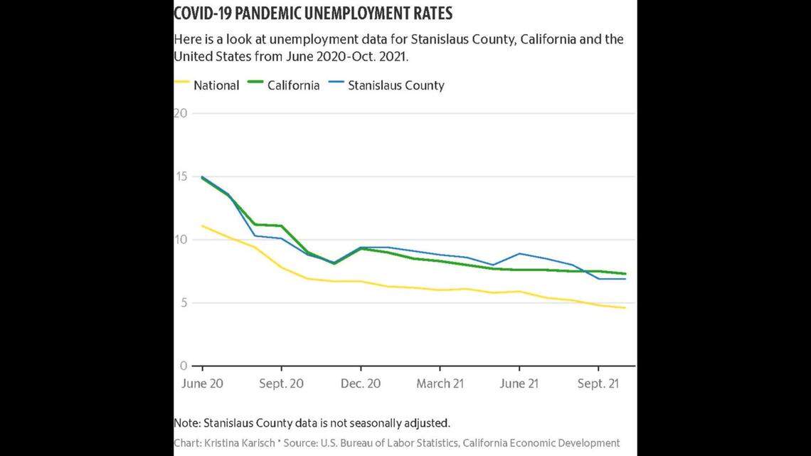 In October 2020, Stanislaus reported 10.3% unemployment, compared with 10.6% in California and 6.9% nationally.