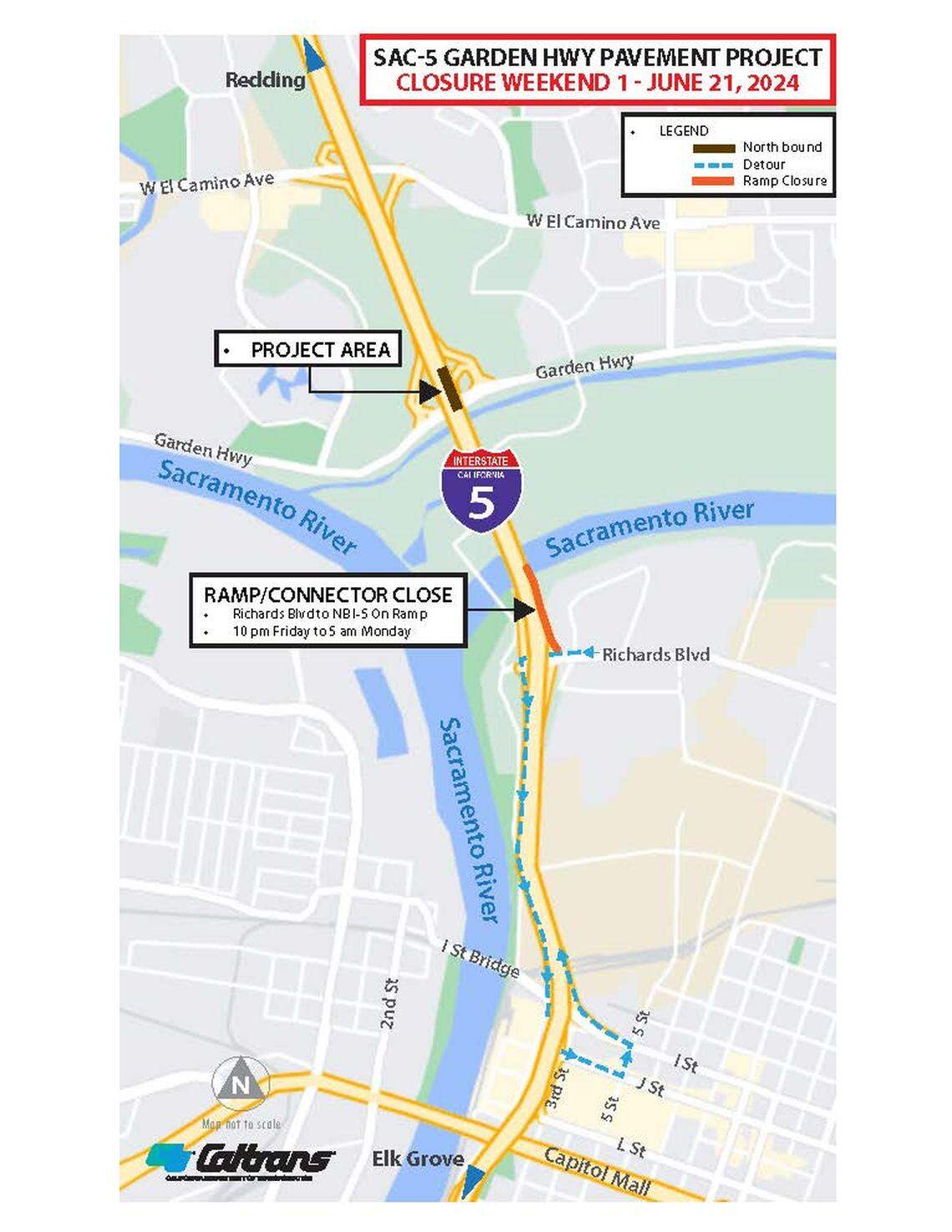 Caltrans recommends continuing westbound on Richards Boulevard and taking southbound I-5.