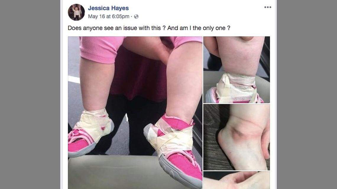 Jessica Hayes posted photos of her daughter's shoes covered in tape to Facebook on May 19. Hayes said her 17-month-old daughter attends Pleasant Hill Daycare in Elkin.