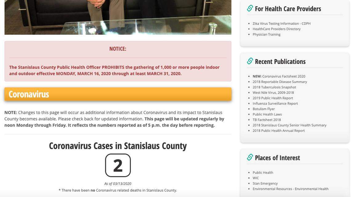 Anyone on a computer or cell phone looking for the latest info got similar treatment from the Stanislaus County Health Services Agency, whose website should be the premier go-to source on coronavirus and COVID-19. All weekend long, viewers were greeted by an old video of the public health officer discussing the crisis with a Bee editor — way back on March 2. A chart with the numbers everyone is looking for remained unchanged since Friday, showing two confirmed cases in the county, 22 negative test results and 20 tests still pending.
