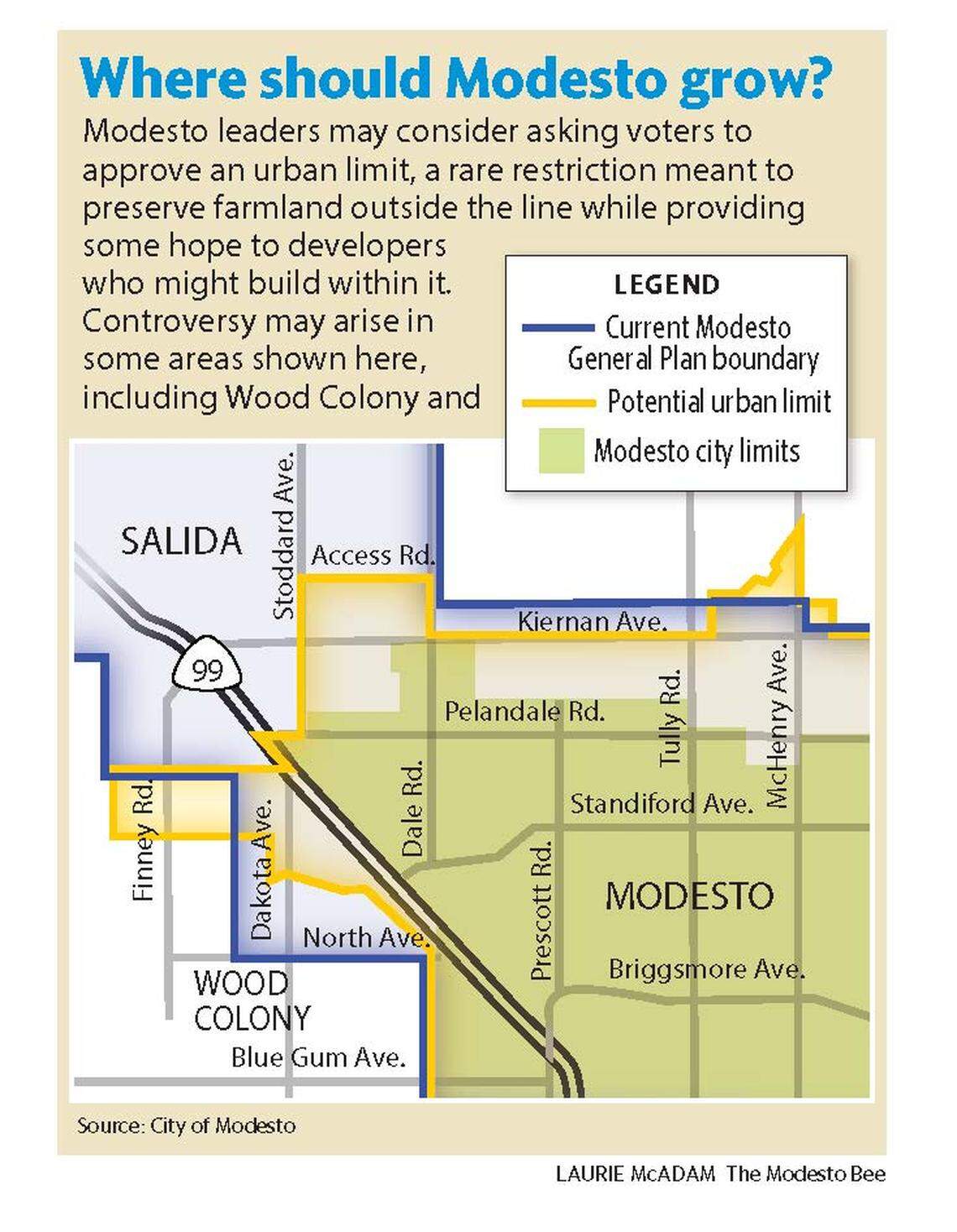 But the proposed limit could hand to Modesto some of the area’s most promising land for future business and industrial development, on both sides of Kiernan Avenue between Dale Road and Stoddard Road. Without that land, Salida — by far the largest unincorporated town in Stanislaus County — may never have a large enough tax base for incorporation.